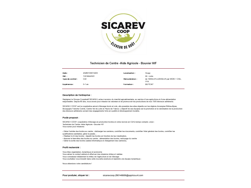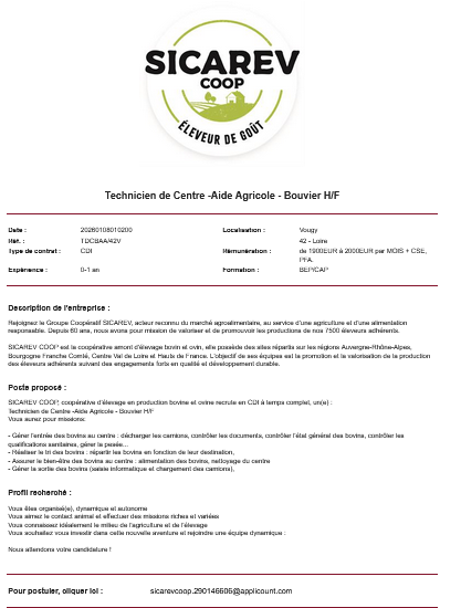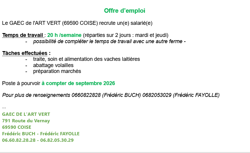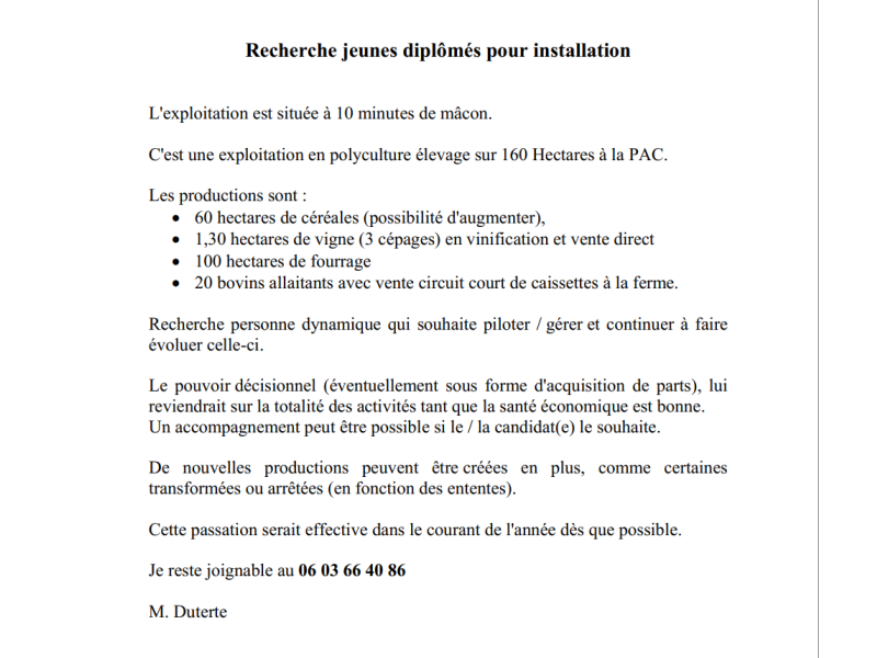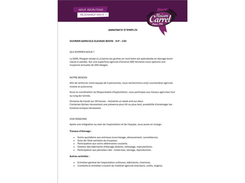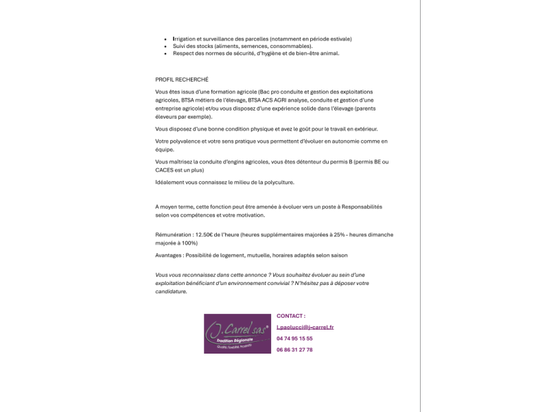 Nous recherchons une personne polyvalente qui aime le contact avec les animaux, qui sait conduire différents engins agricoles. Une personne rigoureuse dans son travail sera très appréciée.